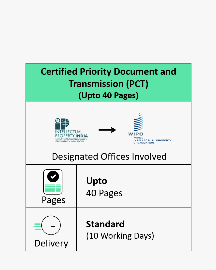 Description: This service includes the preparation of a certified copy of the priority document from the India Patent Office and its transmission to the International Bureau (IB) of WIPO. If you have filed a patent application in India and wish to file an international application under the PCT, this service ensures your priority document is duly certified and submitted to WIPO.