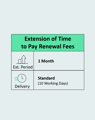 66f03943cb81d900358e086bExtension of Time to Pay Renewal Fees One MonthRequest for extension of time to pay renewal fees or submit pending documents. Applicable Rule/Section: Section 53(2), Section 142(4), Rule 13(6), Rule 80(1A), Rule 130 Note: Includes Patent Office FeesTIPMP-ACD-PAT-UP-PPR-DM-1M-STD-0001