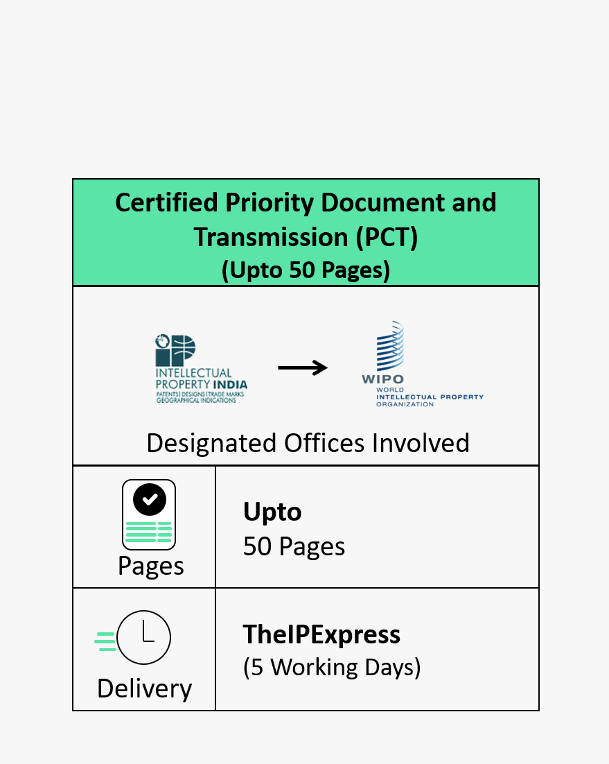 66ee71320bafae0032a5cbc0Certified Priority Document and Transmission (PCT) Upto 50 PagesCertified Priority Document and Transmission (PCT) Upto 50 PagesDescription: This service includes the preparation of a certified copy of the priority document from the India Patent Office and its transmission to the International Bureau (IB) of WIPO. If you have filed a patent application in India and wish to file an international application under the PCT, this service ensures your priority document is duly certified and submitted to WIPO. Key Features: Priority Document Certification: Obtain a certified copy of your original patent application filed in India. Transmission to WIPO: Direct transmission of the certified copy to the International Bureau as required by PCT regulations. Compliance: Ensures that your international application is in full compliance with WIPO s PCT filing requirements.TIPMP-IND-PAT-GIP-PCT-CDT-EXP-50-0001