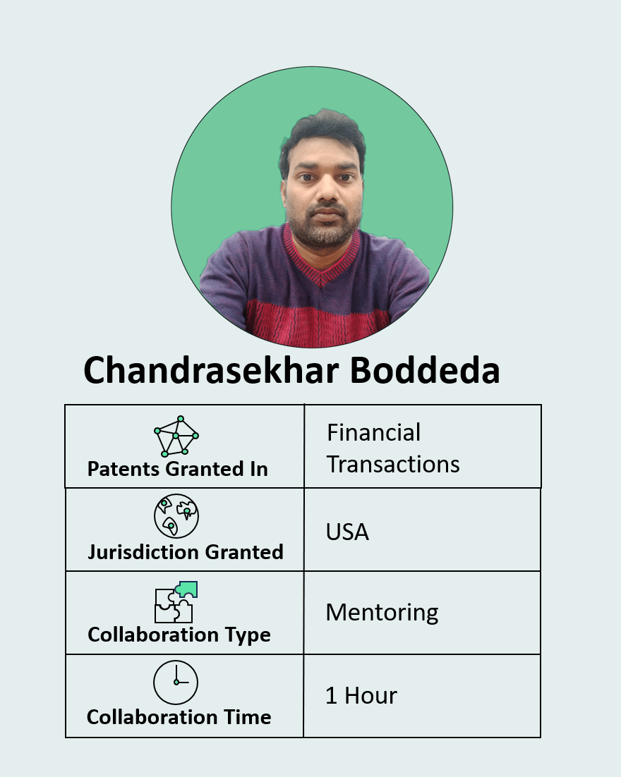 Connect with him for a 60 mins session and get insights in mentoring on financial transactions patenting
