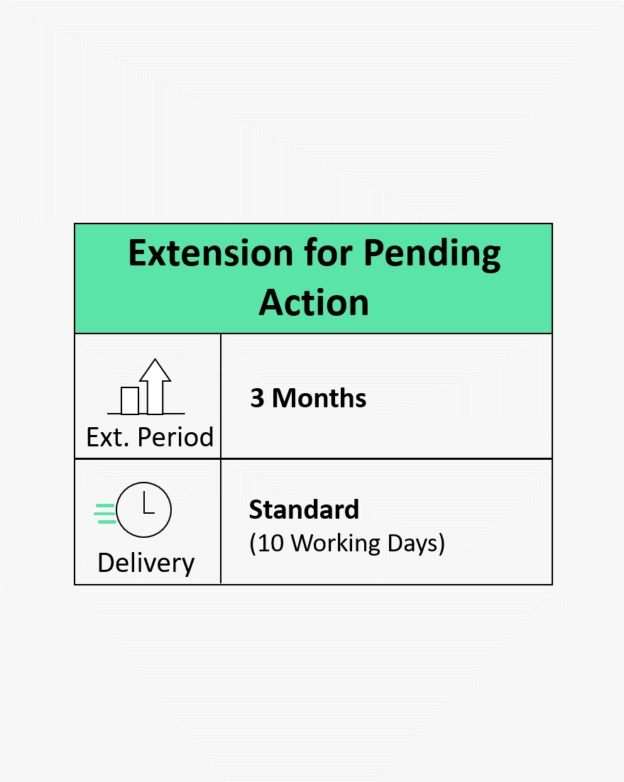 Service Description: This service allows patent applicants to request an extension for any pending actions in their patent application, including responses to formal objections, submissions of additional documents, or other procedural requirements. This extension provides flexibility and ensures that the application remains active while the necessary actions are completed. Who Can Apply: Patent applicants who require more time for any ongoing actions related to their patent application, such as submitting information or addressing formalities. Cost of service includes Patent Office Fees.