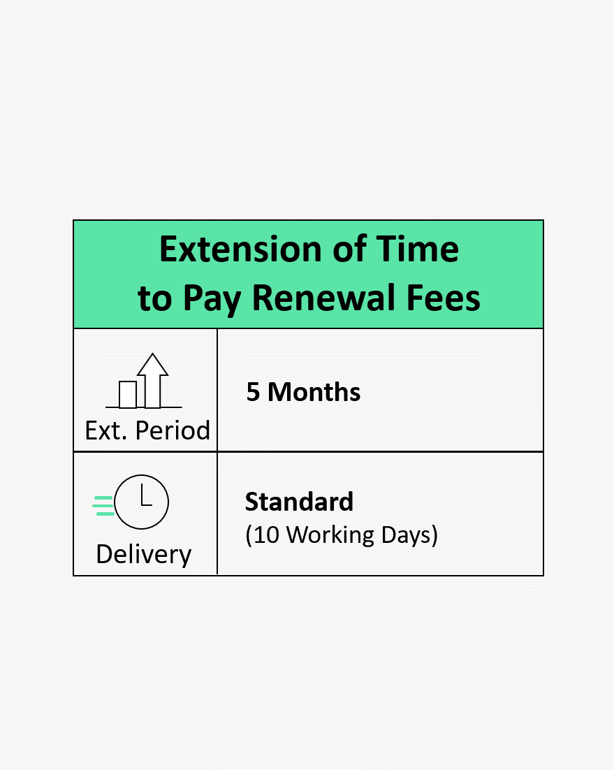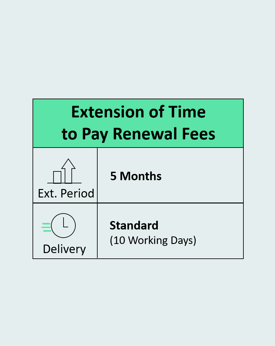 66f047bd3ba2f300246ba31eExtension of Time to Pay Renewal Fees Five MonthsRequest for extension of time to pay renewal fees or submit pending documents. Applicable Rule/Section: Section 53(2), Section 142(4), Rule 13(6), Rule 80(1A), Rule 130 Note: Includes Patent Office FeesTIPMP-IND-PAT-UP-PPR-DMI-5M-STD-0001