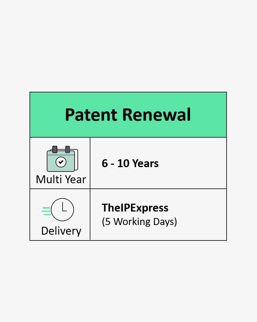66e7e1d6cf7b360036db70dePatent Renewal Duration 6 to 10 YearsRenewal of Patent based duration from 6th year to 10th year. Ensure your patent remains active without any penalties.TIPMP-IND-PAT-UP-RENEW-MYR-EXP-0002