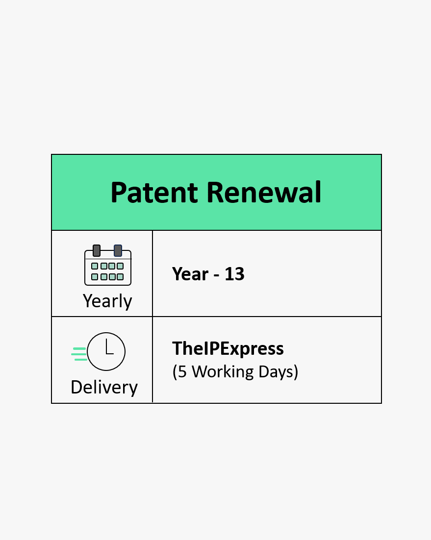 66e7ba8a0cb6910025fceac8Patent Renewal Year 13Renewal of Patent before the expiration of the Year - 12, from the date of your patent to cover the year - 13.Ensure your patent remains active without any penalties.TIPMP-IND-PAT-UP-RENEW-YR-EXP-0013